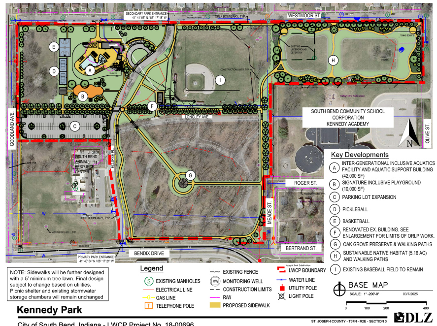 Kennedy Park, located at the corner of Olive St. and Westmoor St., includes the Kennedy Water Playground, a public restroom, walking trails, baseball diamond, basketball courts, playground and open play areas. Kennedy Park has long been a cornerstone of South Bend’s west side, serving as a hub for recreation, connection, and community pride. Now, exciting improvements are on the way. Funded in part by a grant from the Indiana Department of Natural Resources, Kennedy Park will soon feature a brand-new aquatics facility, updated basketball and tennis courts, an improved playground, and enhanced green spaces designed for all ages to enjoy.